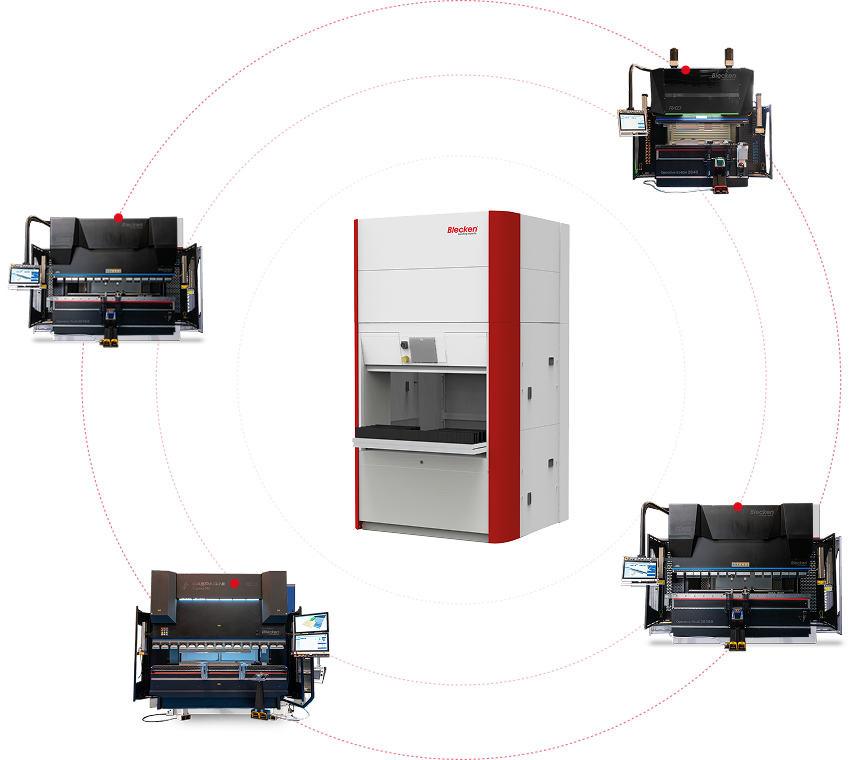 Se puede conectar a la Plegadora gracias al uso de un software de gestión que comunica el almacén con la plegadora. Este tipo de solución le permite ahorrar espacio, tiempo y organizar las herramientas.